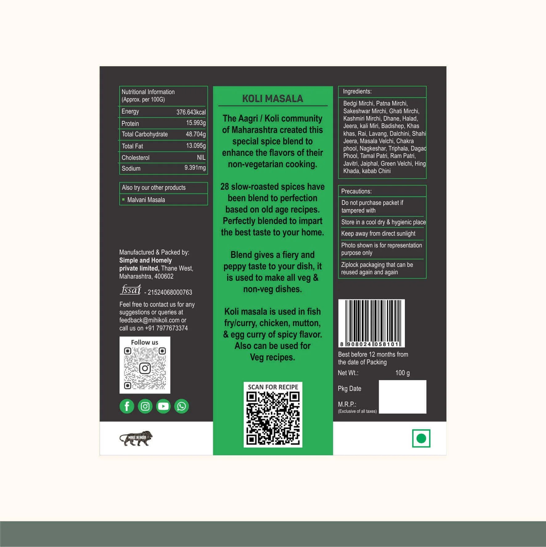 Our artisanal Koli Masala brings you the soul of Mumbai’s coastal cuisine a traditional spice blend rooted in the Koli community’s heritage. Made from 28 handpicked spices with no additives, every pack is an invitation to enjoy vibrant, authentic flavours at home